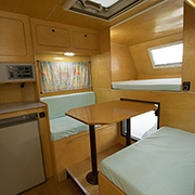 Der Ausbau erfolgte mit Pappelsperrholz (15 mm). In der Nasszelle findet eine Chemietoillette Platz. Die Ausstattung umfasst einen Kühlschrank, einen Boiler, einen 2flammigen Kocher, eine Bordbatterie, 2 Wassertanks, eine Standheizung und eine "Energiezentrale" (Ladegerät, Sicherungen ...). Die Sitzgruppe lässt sich zu einem Bett umbauen und der Alkoven bietet eine Liegefläche von 1,9m Länge und 1,45m Breite. Notfalls gelangt man von der Wohnkabine in das Fahrzeug. Stauräume sind ausreichend vorhanden und der Gasraum bietet Platz für 2 11kg Gasflaschen.