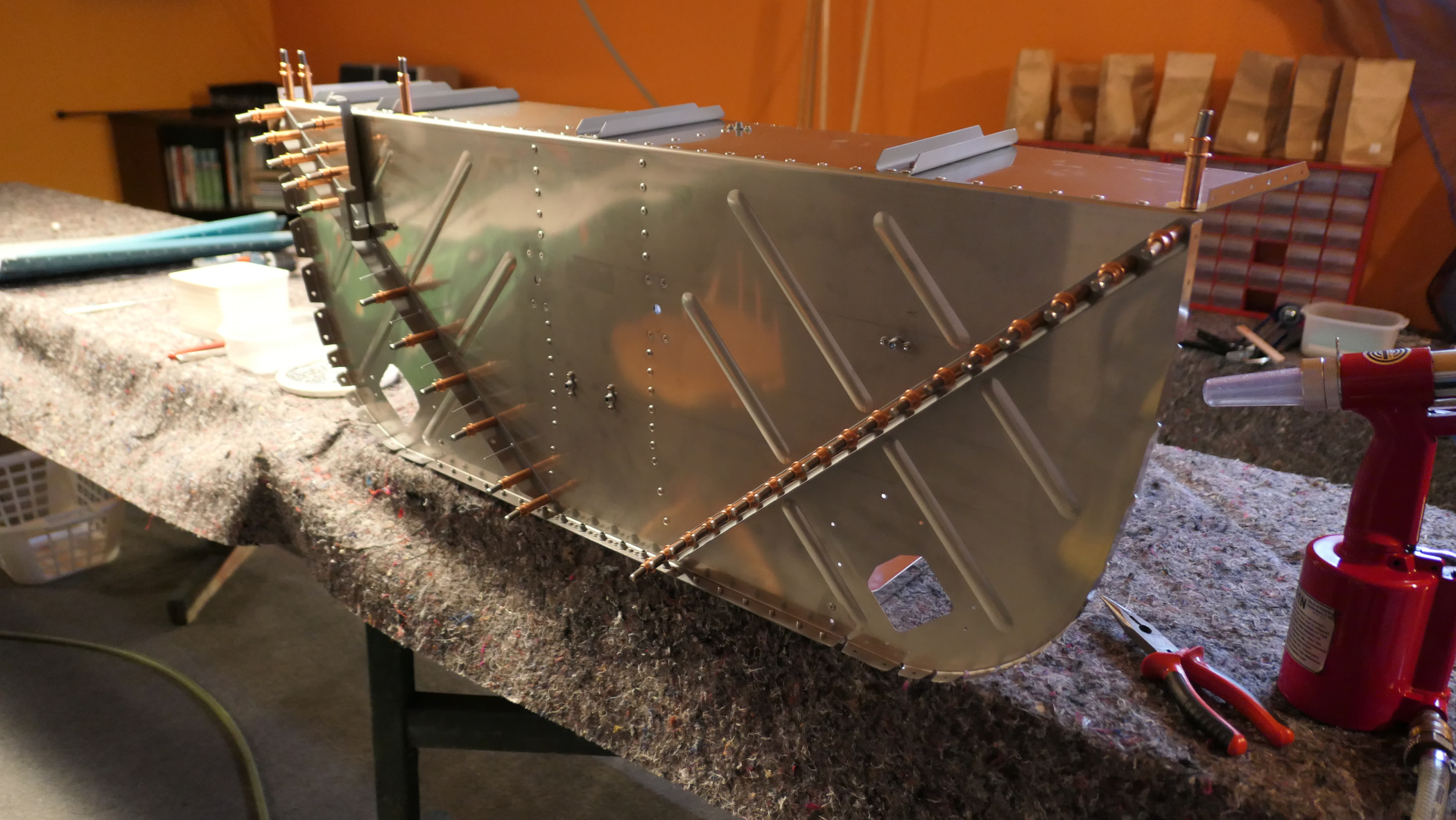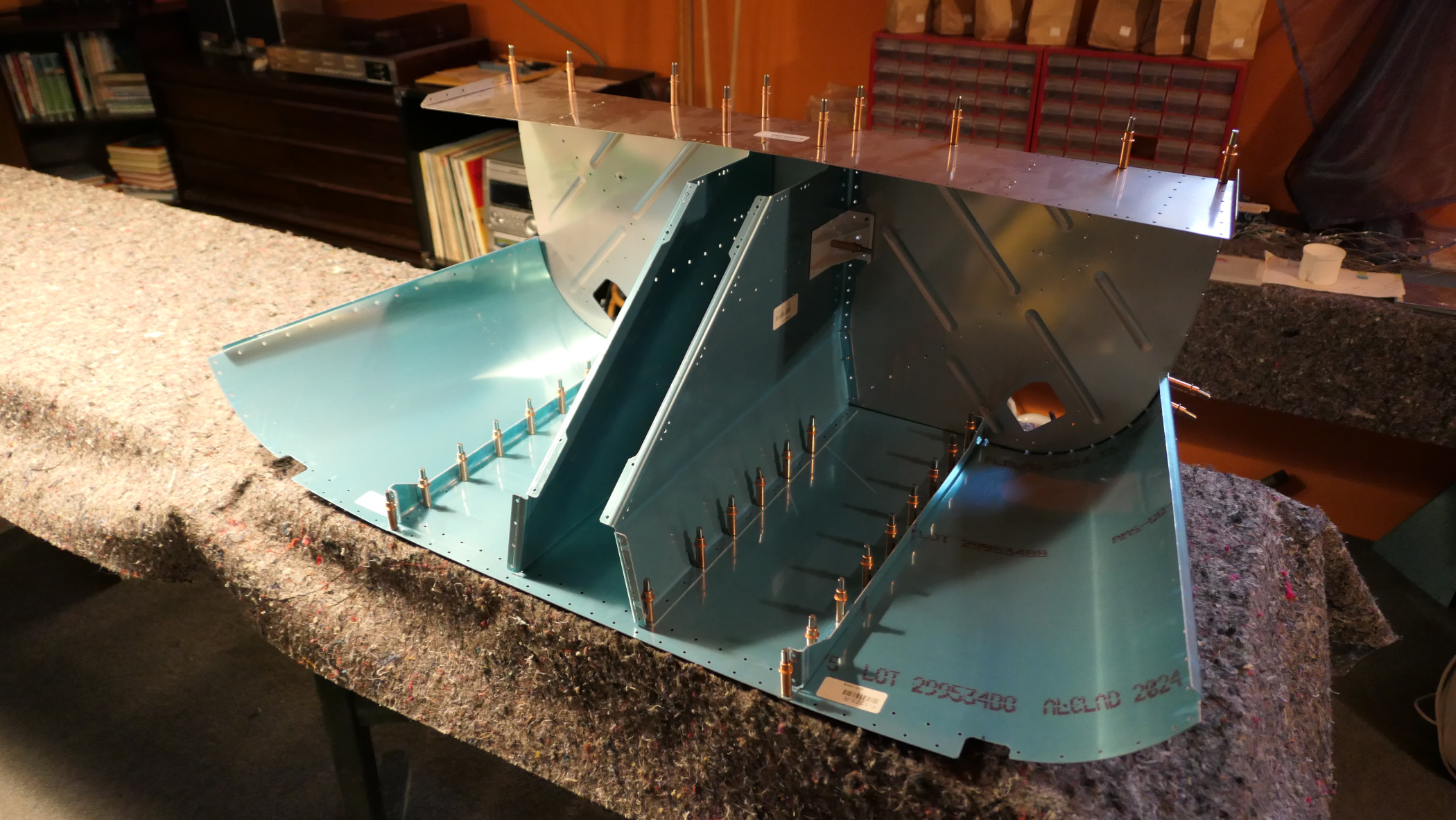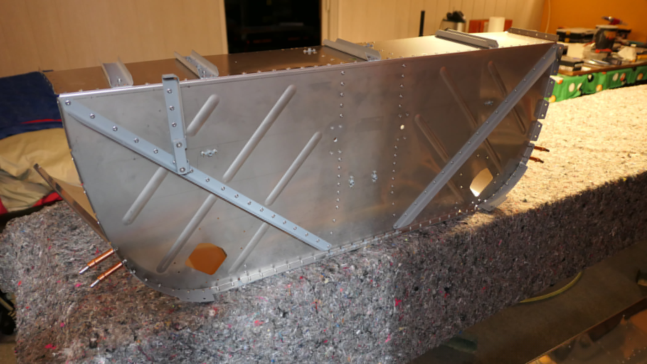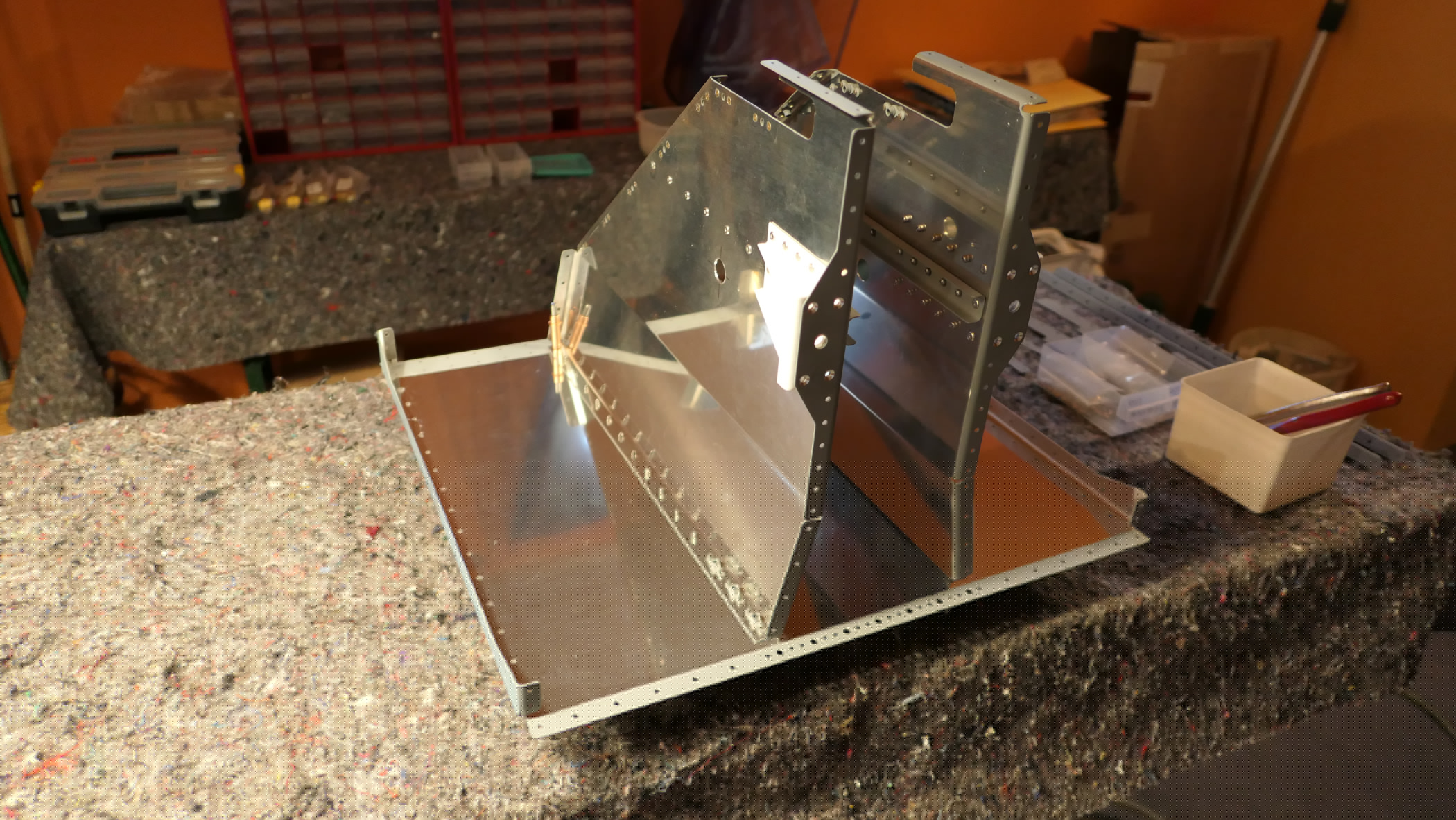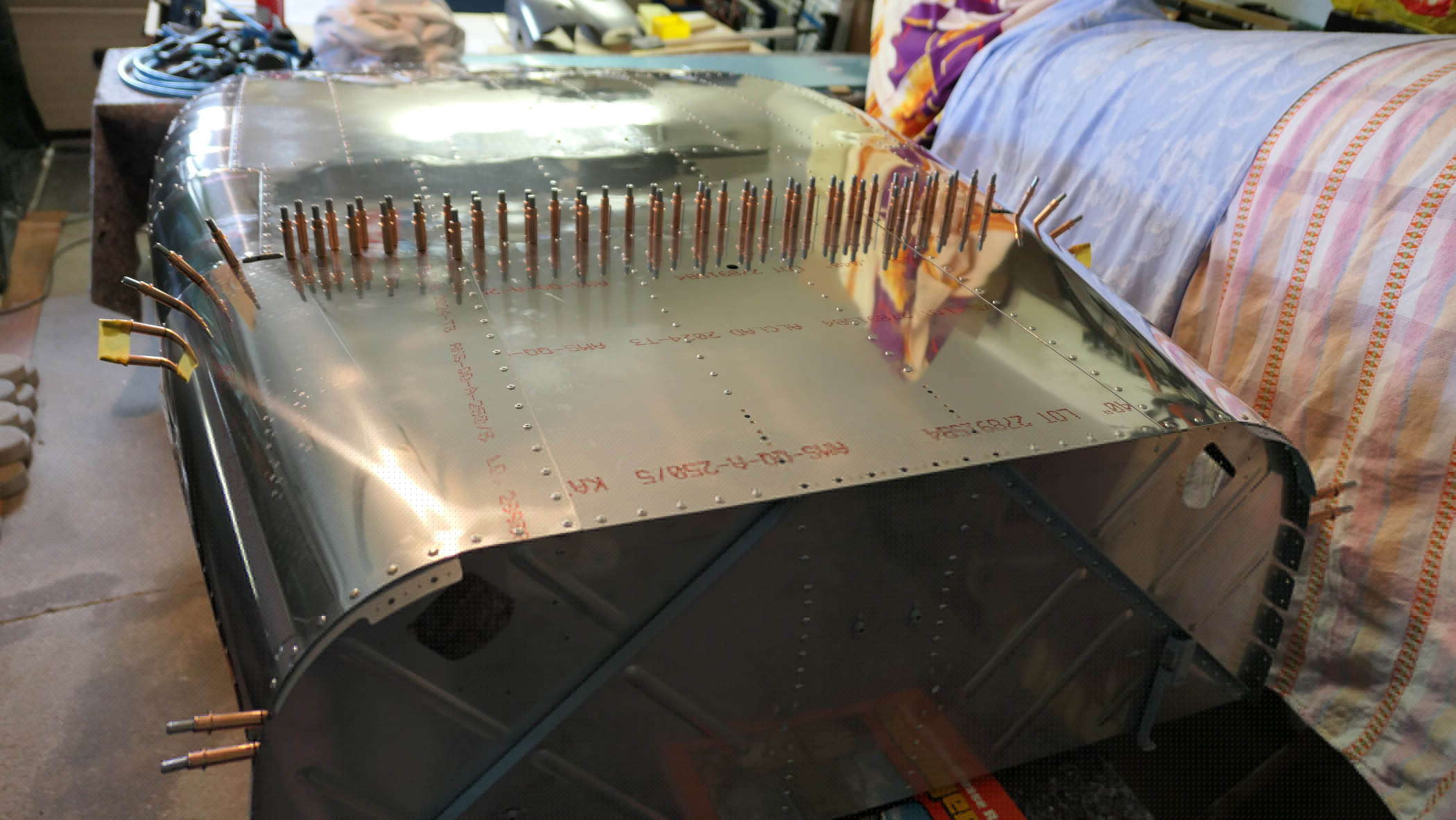 Vorderer Bereich des Fußraumes und Brandschott mit Clecos geheftet