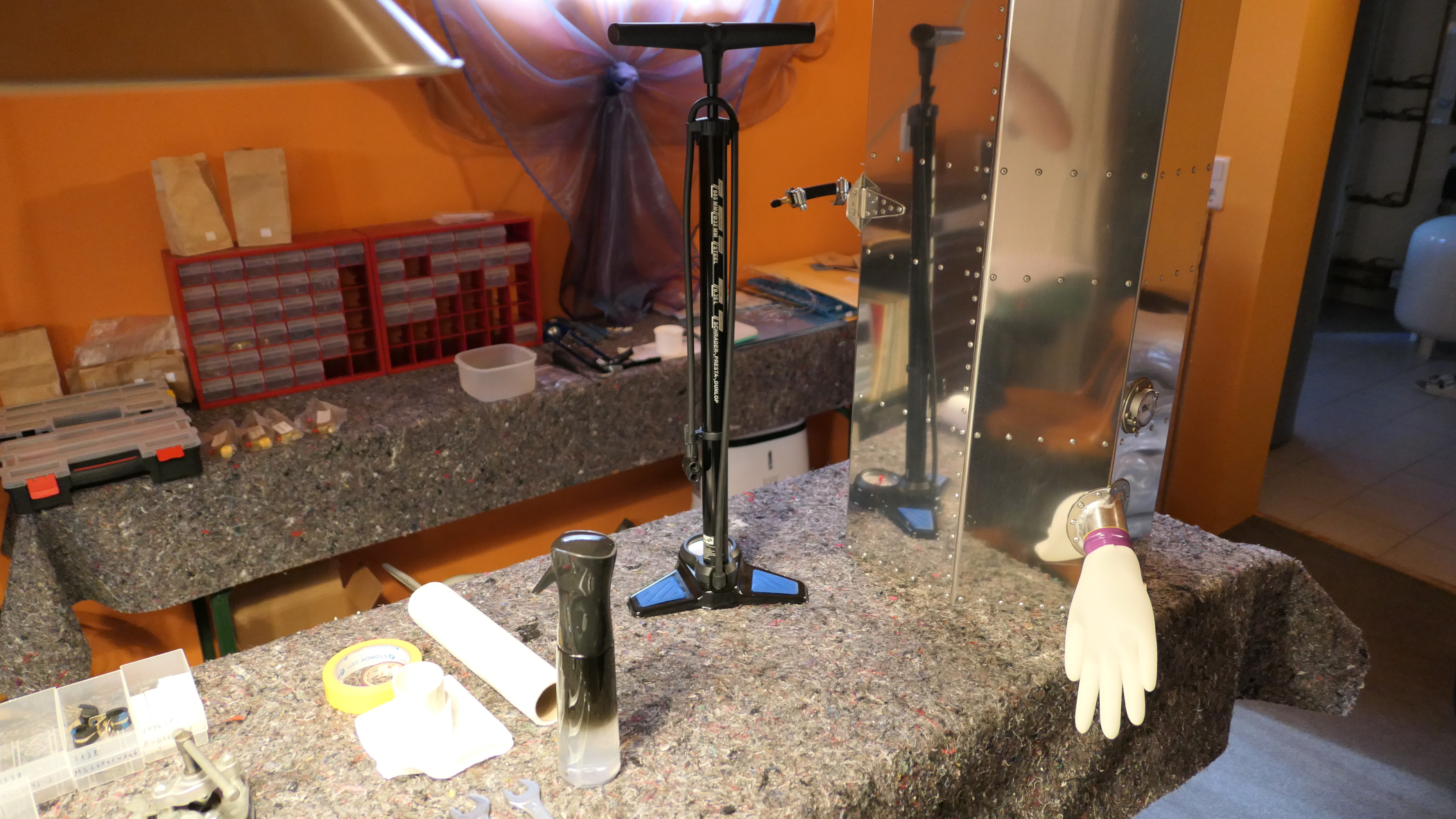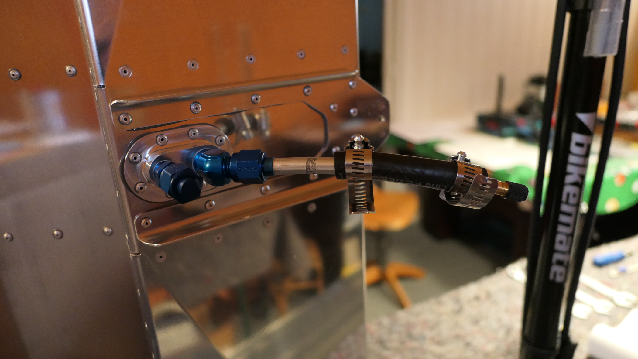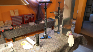 Druckprüfung: Mit einer Handpumpe wurde der Druck im Tank auf max. 1 PSI gebracht. Der Handschuh dient dabei als Druckausgleich. Es wurden alle Nieten, Verschraubungen, Blechverbindungen, ... mit Seifenwasser bestrichen und auf Dichtheit geprüft. So schön Seifenblasen sein können, dabei möchte man keine sehen!