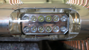 Die Rückseite des Scheinwerfers zeigt die Kabelführung.