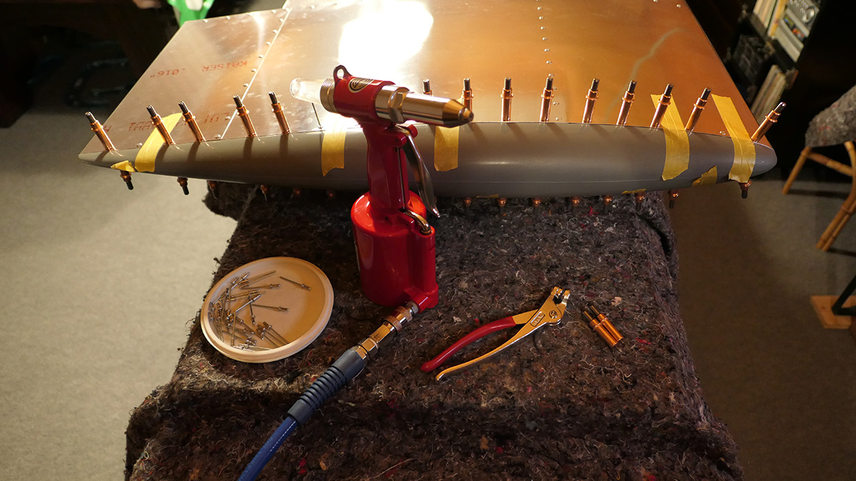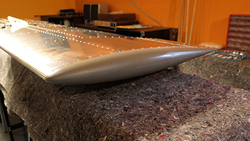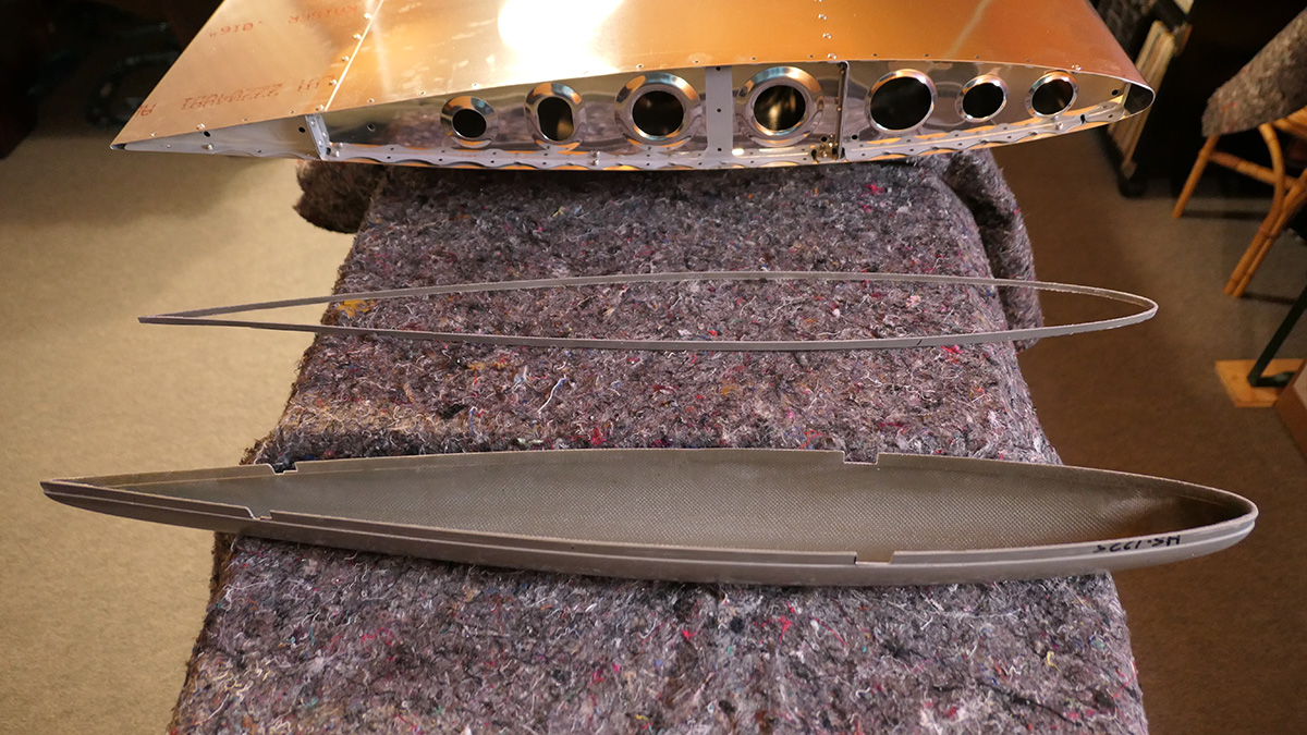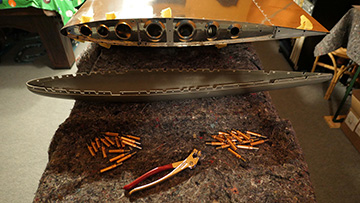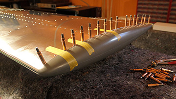 Der Randbogen wird fixiert und die Bohrlöcher werden übertragen. Jede Bohrung wird sofort mit Clecos versehen. Anschließend wird der Randbogen abgenommen und der Bohrstaub entfernt. Danach wird der Randbogen vernietet.