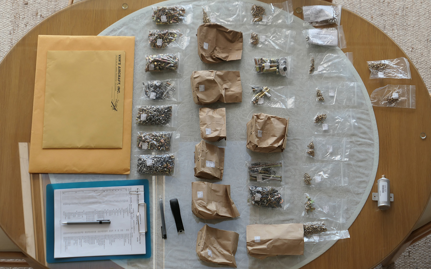 Um den Inhalt der Kisten auf Vollständigkeit zu überprüfen und ev. fehlende Teile zu reklamieren, bekommt man 30 Tage Zeit. Der Zeitraum startet mit der Anlieferung des KITs. Der Satz auf den Beuteln mit den Kleinteilen "It isn't necessary to count the rivets, but do count everything else." amüsiert zuerst, doch wird diese Anweisung mit der Zeit zur Herausforderung und zu einem Geduldsspiel.
