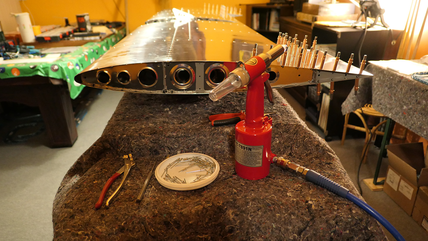 Entsprechend der Empfehlung von VAN's startet der Bau mit dem "EMPENNAGE / TAILCONE KIT". Laut Bauhandbuch ist zu Beginn ein Werkzeug herzustellen, mit dem Nieten an seitlich knapp erreichbaren Stellen gesetzt werden können. Danach beginnt der eigentliche Bau. Die Anweisungen im Bauhandbuch sind sehr detailliert und beschreiben jeden Schritt. Teile müssen separiert, entgratet und bereits vorhandene / gestanzte Löcher müssen auf die finale Größe gebracht werden. Mit Clecos (Heftnadeln) werden Teile verbunden, damit Bohrungen durch die verbundenen Teile ausgeführt werden können. Danach werden die Heftnadeln wieder entfernt und mit Feilen, Entgratungswerkzeug und einer Polierscheibe bearbeitet. Im nächsten Schritt müssen dann die Teile, deren vor Korrosion schützende ALCLAD-Beschichtung (sehr dünne Schicht aus Reinaluminium) z.B. durch Schleifen ganz oder teilweise entfernt wurde, mittels Primer gegen Korrosion geschützt werden, bevor sie dann endgültig vernietet werden können.
